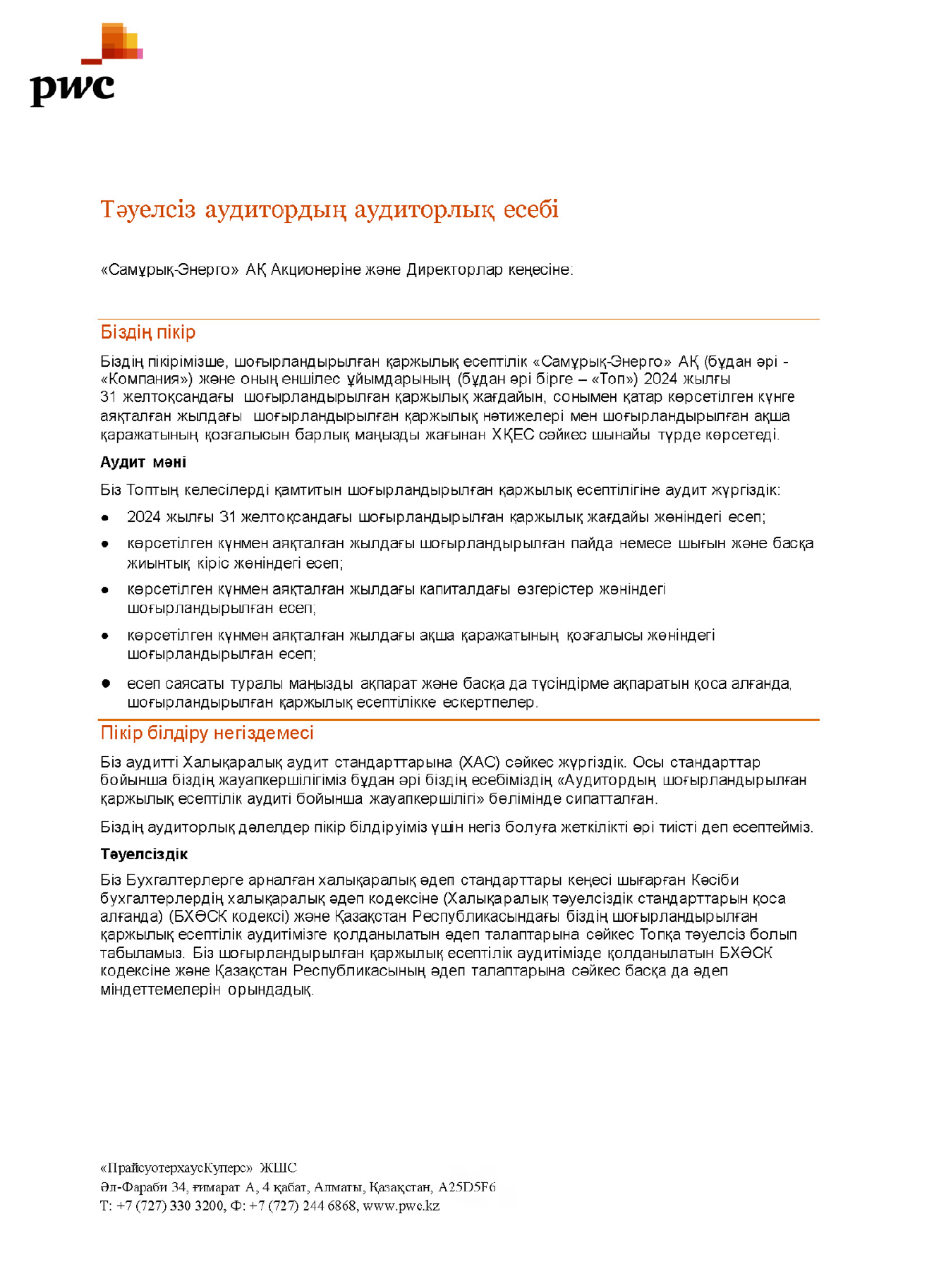 ХҚЕС бухгалтерлік есеп стандарттары Шоғырландырылған қаржылық есептілік және Тәуелсіз аудитордың аудиторлық есебі