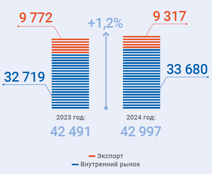 Объем производства электроэнергии за 2024 год составил 39 772 млн кВтч, что выше на 12,6% или 4 442 млн кВтч в сравнении с прошлым годом. Основное увеличение произошло по АО «Мойнакская ГЭС» на 238 млн кВтч (на 28,6%), АО «Шардаринская ГЭС» на 54 млн кВтч (на 10%) по причине увеличения водности бассейнов, АО «Станция Экибастузская ГРЭС-2» на 386 млн кВтч (на 7%) в связи с увеличением продажи электроэнергии Единому закупщику из-за выхода из строя оборудования ТОО «Экибастузская ГРЭС-1». В объем производства электроэнергии за 2024 г. также вошла выработка УКГЭС и ШГЭС, включенных в периметр АО «Самрук-Энерго» с 2024 г.