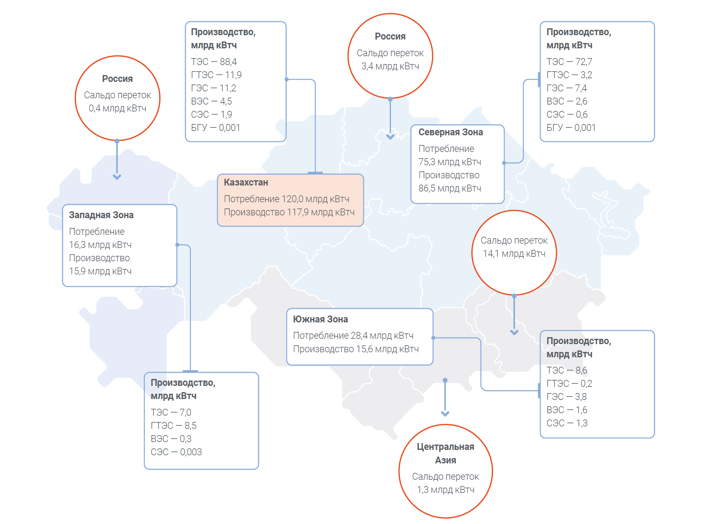 В Северной зоне, в месте расположения основных угольных месторождений и гидроэнергетических ресурсов в 2024 году было произведено – 73,3% (86,5 млрд кВтч) от общего объема производимой в стране электроэнергии. Северная профицитная зона покрывает дефициты электроэнергии в Южной зоне, а также обеспечивает экспортный потенциал Казахстана.