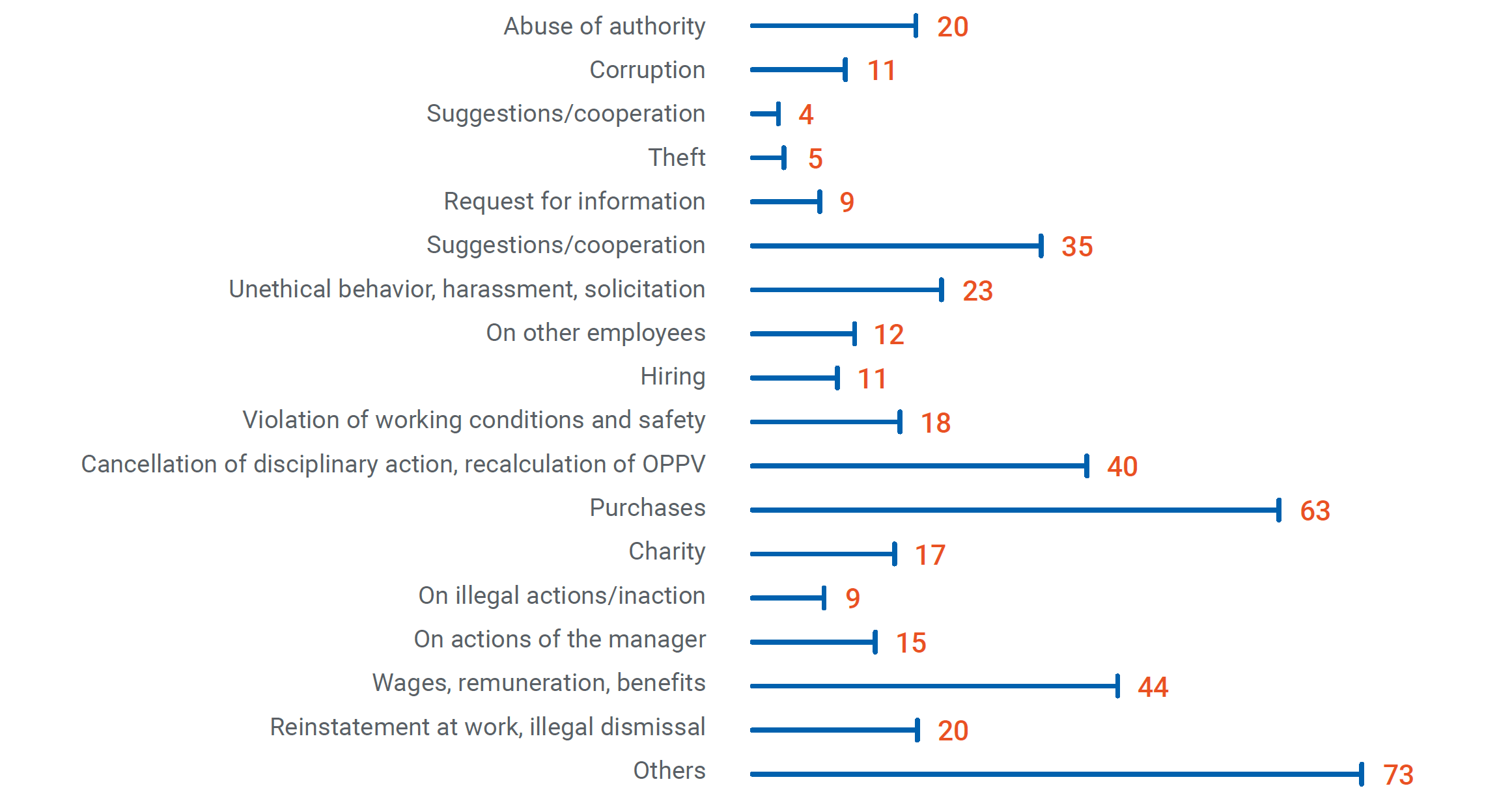 Applicants were interested in issues related to the cancellation of orders for disciplinary action, organisation of work, violations of occupational safety and labour legislation. Appeals related to unethical behaviour and abuse of authority were also recorded.