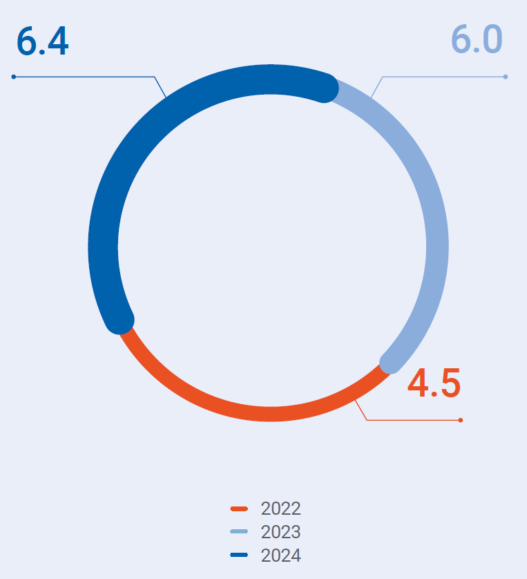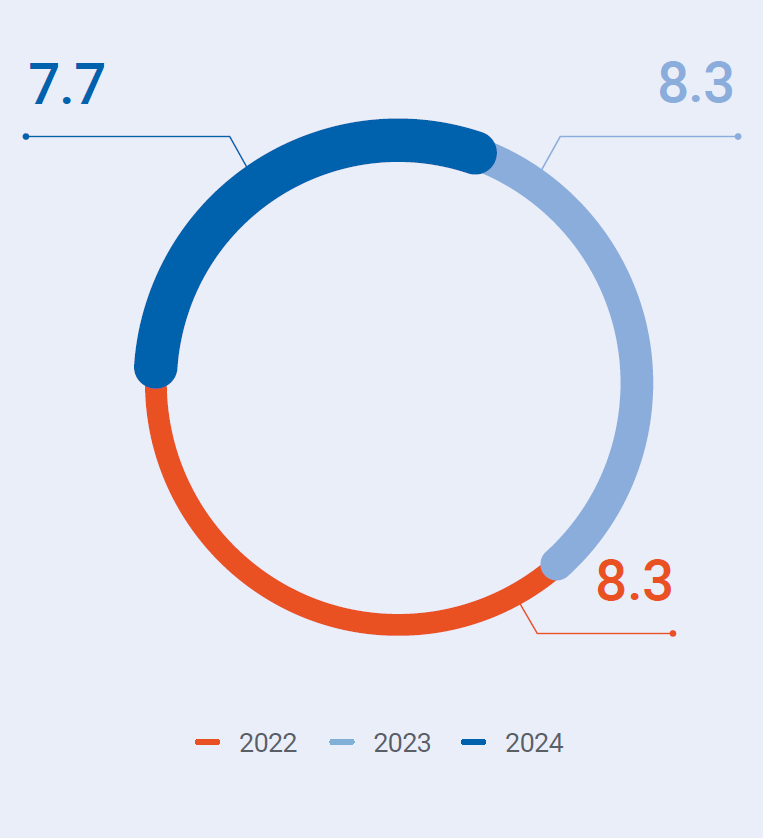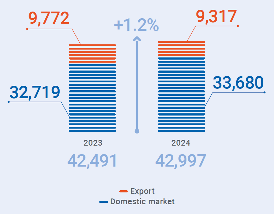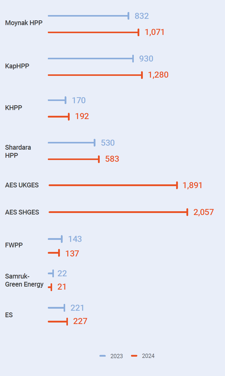 Electricity generation in 2024 amounted to 39,772 million kWh, which is 12.6% or 4,442 million kWh higher than last year. The main increase was due to Moynak HPP JSC by 238 million kWh (28.6%), Shardara HPP JSC by 54 million kWh (10%) due to increased water inflow, Ekibastuz GRES-2 JSC by 386 million kWh (7%) due to increased electricity sales to the Single Buyer as a result of equipment failure at Ekibastuz GRES-1 LLP. The 2024 electricity generation volume also included the output of UKHPP and SHPP, included in the perimeter of Samruk-Energy JSC from 2024.
