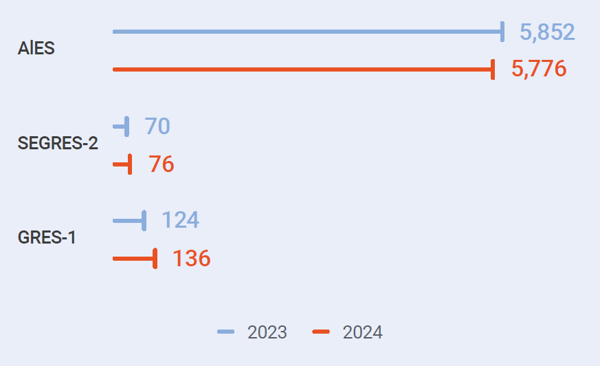 In January–December 2024, compared to the same period of 2023, electricity consumption among large consumers increased by 1,638.2 million kWh, or 4.5%. In particular, in January–December 2024, electricity consumption by Samruk-Energy JSC companies increased by 1,656.6 million kWh, or 19.6% compared to 2023.