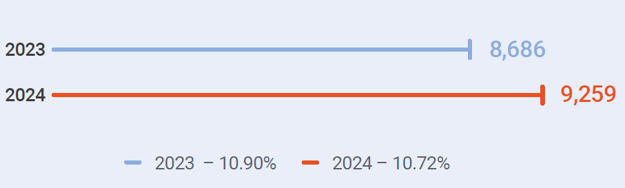 The volume of electricity transmission through Alatau Zharyk Company JSC (AZhK) grids in 2024 amounted to 9,259 million kWh, which is 7% or 572 million kWh higher than the 2023 actual.