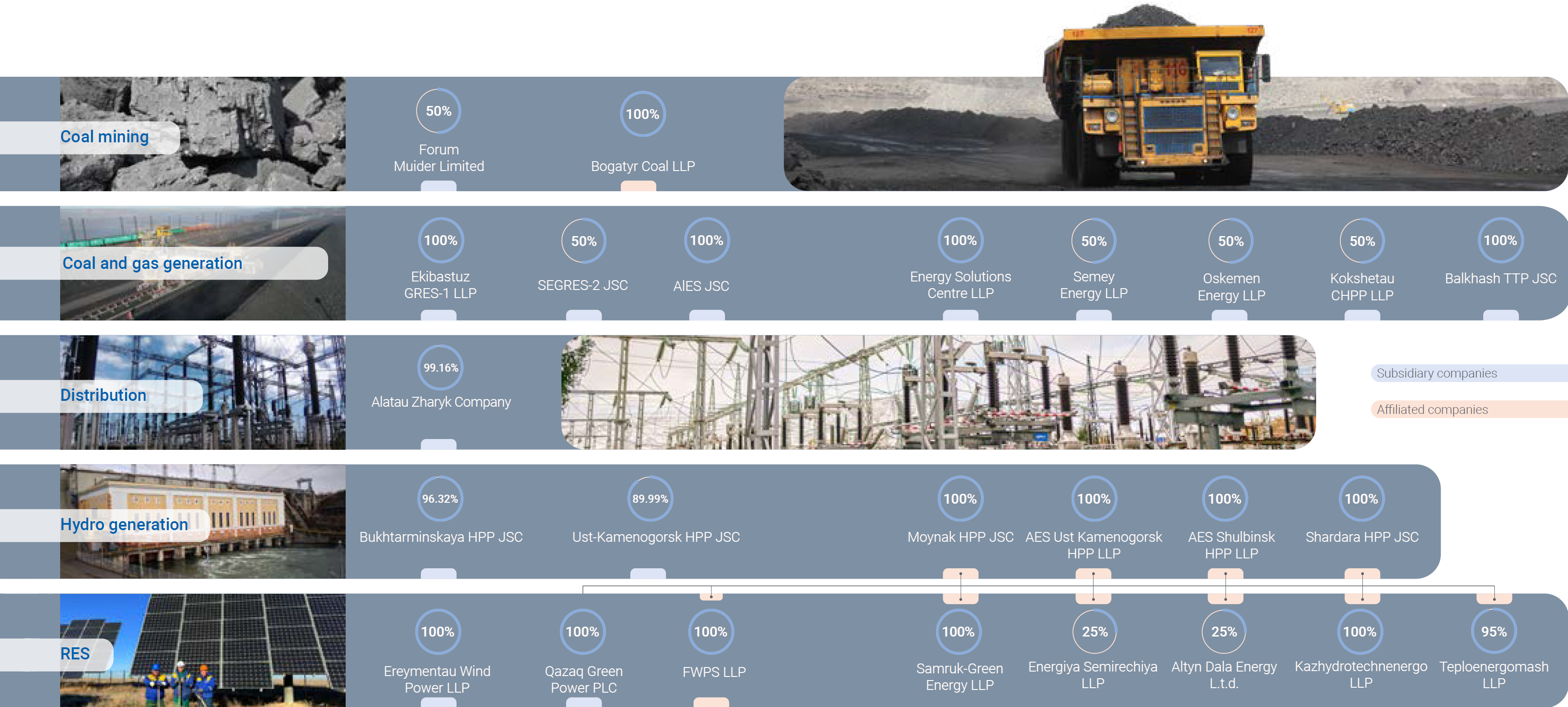 In 2024, Samruk-Energy JSC made a number of strategic changes aimed at optimisation of asset management and development of the energy sector. On 14 May, 100% participation shares in AES Ust Kamenogorsk HPP LLP and AES Shulbinsk HPP LLP were included in the perimeter of the company's assets. On 17 June, the Group of Samruk-Energy JSC took into trust management the property complex of Ekibastuz CHPP owned by Ekibastuz Akimat. On 24 June, together with Samruk-Kazyna JSC, three joint ventures with equal distribution of shares (50% each) were established: Kokshetau TPP LLP, Semey Energy LLP and Oskemen Energy LLP.