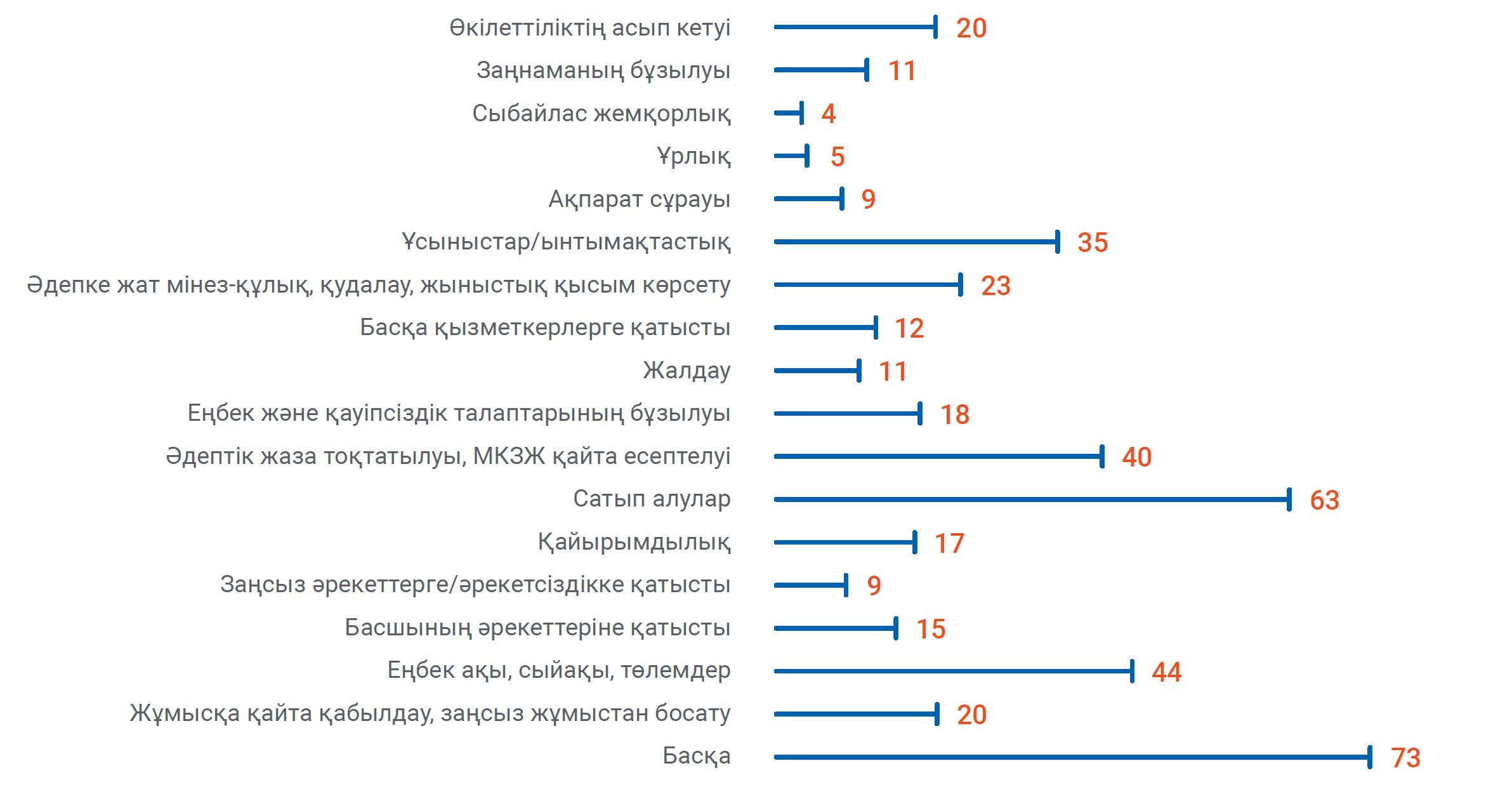 Өтініш берушілерді тәртіптік жауапкершілікке тарту, еңбекті ұйымдастыру, қауіпсіздік техникасы мен еңбек заңнамасының еңбек жағдайларын бұзу туралы бұйрықтардың күшін жоюға байланысты мәселелер қызықтырды. Сондай-ақ, әдепсіз мінез-құлыққа және лауазымдық өкілеттіктерді асыра пайдалануға байланысты өтініштер тіркелді.