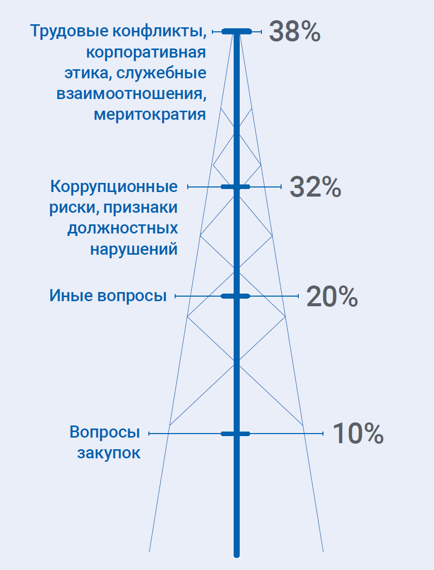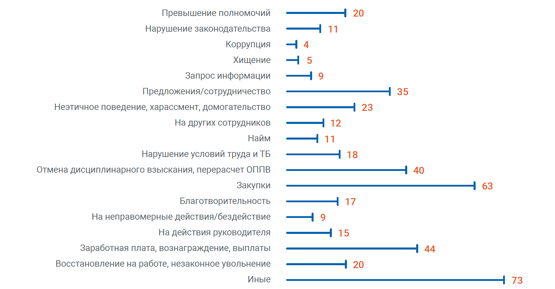 Наибольшее количество обращений связано с вопросами по процедурам закупок, заработной платы, вознаграждений и иных выплат, отмены дисциплинарного взыскания и перерасчета ОППВ.