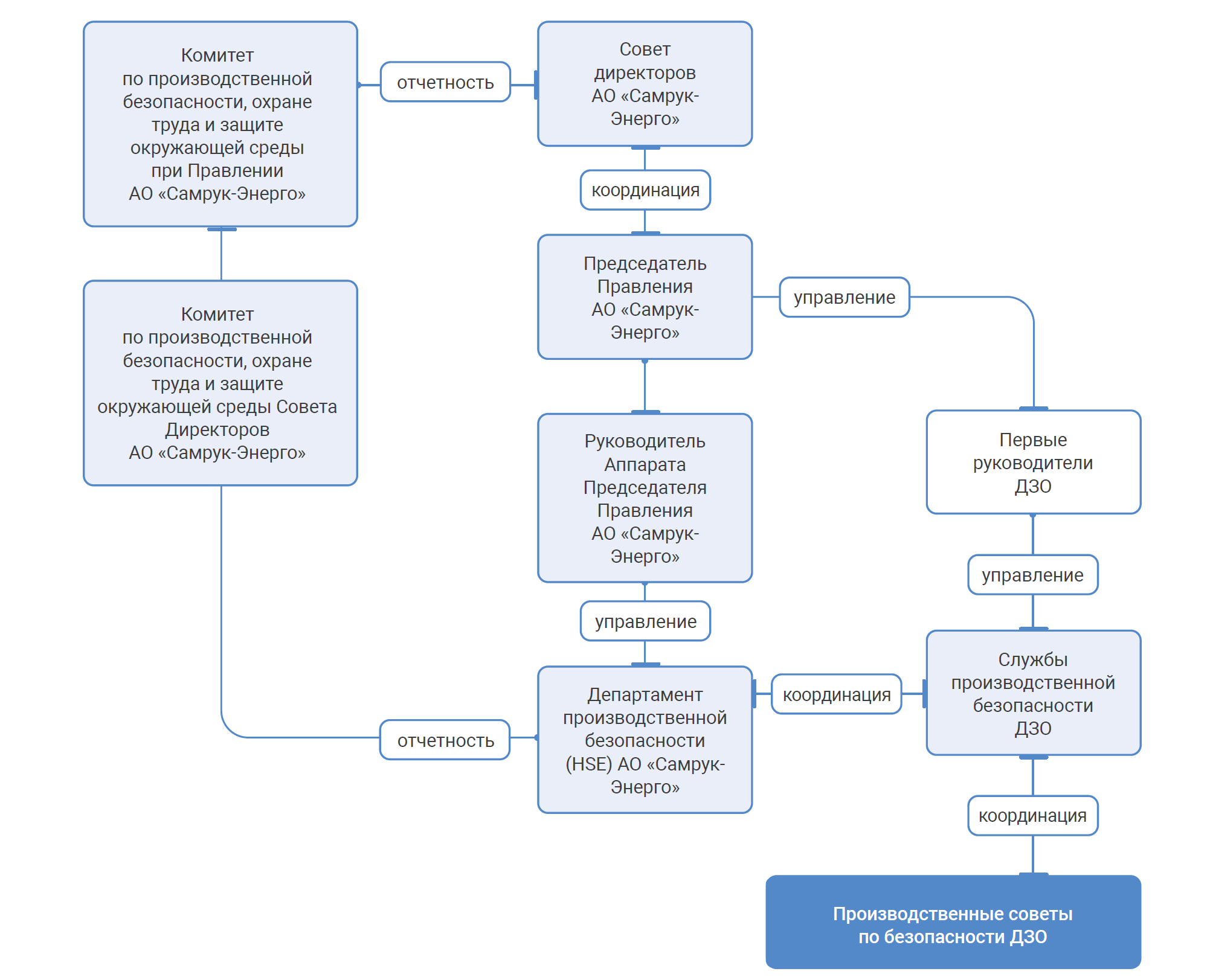 Координацию вопросов безопасности осуществляет директор по HSE, который отчитывается перед Председателем Правления и контролирует реализацию мер по улучшению системы охраны труда в компании и ДЗО. Руководитель подразделения HSE отвечает за предотвращение нарушений, реагирование на инциденты, мониторинг и анализ рисков. В дочерних организациях службы производственной безопасности подчиняются первым руководителям, а их квалификационный состав регулярно пересматривается для повышения эффективности.