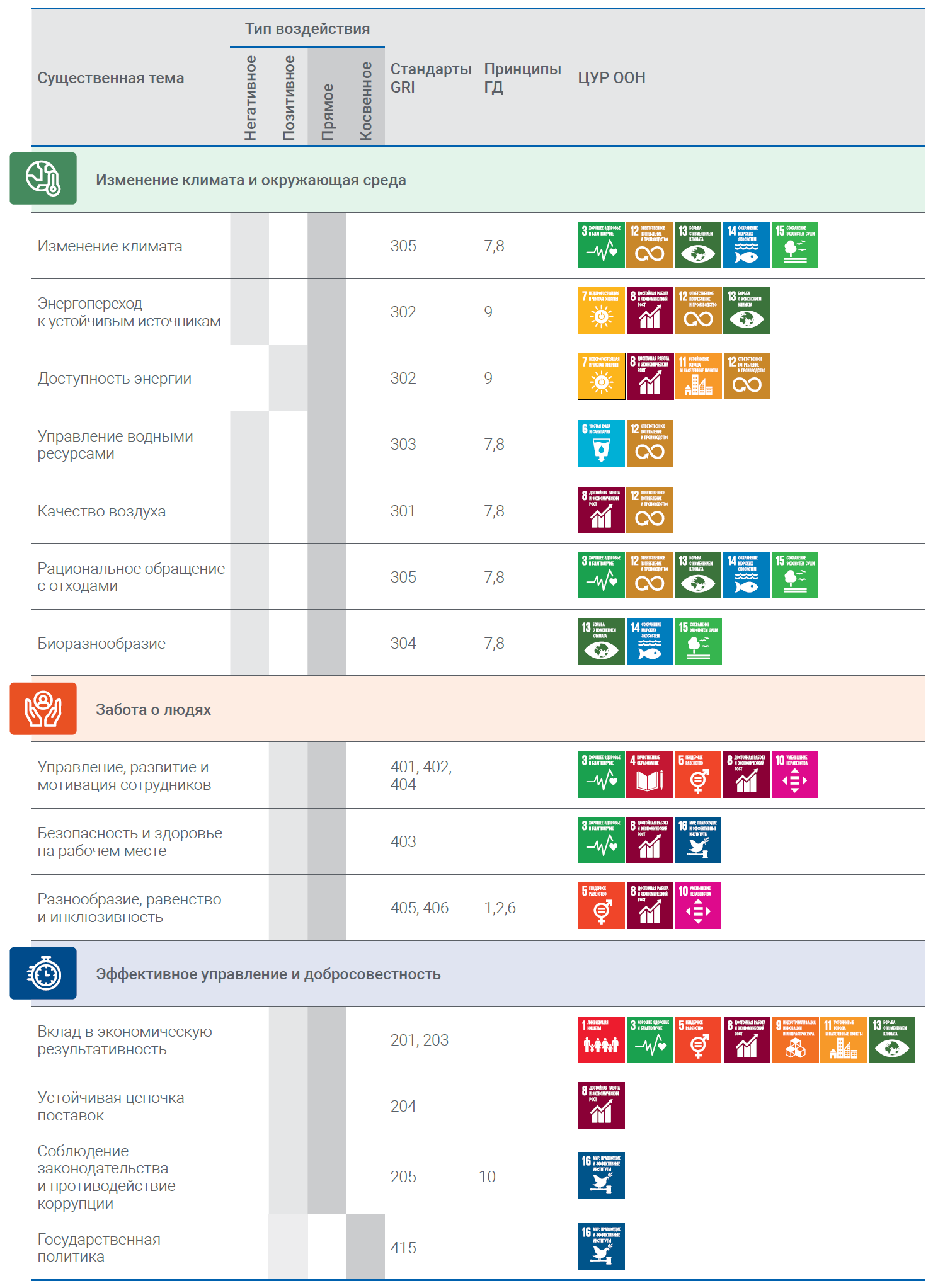 Выбор наиболее существенных тем проведен на основе принципа «двойной существенности»: мы учли темы, которые являются наиболее существенными с точки зрения влияния на финансовые результаты Компании и темы, которые являются наиболее существенными для общества с точки зрения наших воздействий.